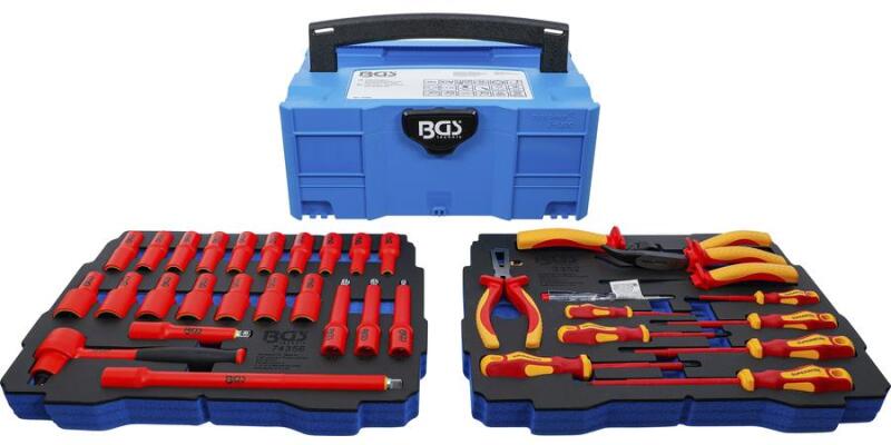 Szigetelt szerszámokkal felszerelve és a DIN EN/IEC 60900 szabvány szerint tesztelve. VDE szigetelés 1000 V-ig. Intelligens szállítási és tárolási rendszer. Egykezes működtetés: zárás, nyitás és csatlakoztatás más rendszerekhez. Stabil ABS műanyagból készült. Funkcionális fogantyú és T-Loc zárószerkezet. Ez a tok egy többkomponensű rendszer része, egymásra rakható (a tartályok egymáshoz rögzíthetők és szállíthatóak). Védőbetét a felső fedélben. Belső méretek: szélesség 383 mm | magasság 127,5 mm | mélység 267 mm. Fröccsenésálló. Szerszámtálcák nagy ellenállású habszivacsból. A szerszámok a kemény habszivacs tálcában védve vannak, és csúszásmentesen tárolhatók a mélyedésekben. Minden egyes szerszámnak megvan a megfelelő helye. Anyag: króm-vanádium acél. Tartalom: 1 VDE lapos csavarhúzó | SL 3 mm-es | pengehossz 75 mm (BGS 4925) 1 VDE lapos csavarhúzó | SL 4 mm-es | pengehossz 100 mm (BGS 4924) 1 VDE lapos csavarhúzó | SL 5,5 mm-es | pengehossz 125 mm (BGS 4940) 1 VDE lapos csavarhúzó | SL 6,5 mm-es | pengehossz 150 mm (BGS 4941) 1 VDE philips csavarhúzó | PH0 | pengehossz 75 mm (BGS 4942) 1 VDE philips csavarhúzó | PH1 | pengehossz 80 mm (BGS 4926) 1 VDE philips csavarhúzó | PH2 | pengehossz 100 mm (BGS 4927) 1 feszültségmérő | 120 - 250 V | 140 mm (BGS 725) 1 VDE blankoló fogó | 160 mm (BGS 7156) 1 VDE hosszú orrú fogó | 160 mm (BGS 7151) 1 VDE hosszú orrú fogó | 200 mm (BGS 7152) 1 VDE hosszú orrú fogó | hajlított | 200 mm (BGS 7153) 1 VDE csípőfogó | 160 mm (BGS 7154) 1 VDE megfordítható racsnis hajtókar | 10 mm (3/8") | 1000 V, gyorskioldóval, fogak száma a racsni fejében: 72, hossza: 200 mm (BGS 701) 1 VDE hatlapú dugókulcs, 6 mm, hossza: 72 mm 1 VDE hatlapú dugókulcs, 7 mm, hossza: 72 mm 1 VDE hatlapú dugókulcs, 8 mm, hossza: 72 mm 1 VDE hatlapú dugókulcs, 9 mm, hossza: 72 mm 1 VDE hatlapú dugókulcs, 10 mm, hossza: 72 mm 1 VDE hatlapú dugókulcs, 11 mm, hossza: 72 mm 1 VDE hatlapú dugókulcs, 12 mm, hossza: 72 mm 1 VDE hatlapú dugókulcs, 13 mm, hossza: 72 mm 1 VDE hatlapú dugókulcs, 14 mm, hossza: 72 mm 1 VDE hatlapú dugókulcs, 15 mm, hossza: 72 mm 1 VDE hatlapú dugókulcs, 16 mm, hossza: 72 mm 1 VDE hatlapú dugókulcs, 17 mm, hossza: 72 mm 1 VDE hatlapú dugókulcs, 18 mm, hossza: 72 mm 1 VDE hatlapú dugókulcs, 19 mm, hossza: 72 mm 1 VDE hatlapú dugókulcs, 20 mm, hossza: 72 mm 1 VDE hatlapú dugókulcs, 21 mm, hossza: 72 mm 1 VDE hatlapú dugókulcs, 22 mm, hossza: 72 mm 1 VDE hosszabbító rúd, hossza: 100 mm 1 VDE hosszabbító rúd, hossza: 250 mm 1 VDE XZN dugókulcs, 10 mm (3/8") befogás | M8, hossza: 67 mm 1 VDE XZN dugókulcs, 10 mm (3/8") befogás | M10, hossza: 67 mm 1 VDE XZN dugókulcs, 10 mm (3/8") befogás | M12, hossza: 67 mm
