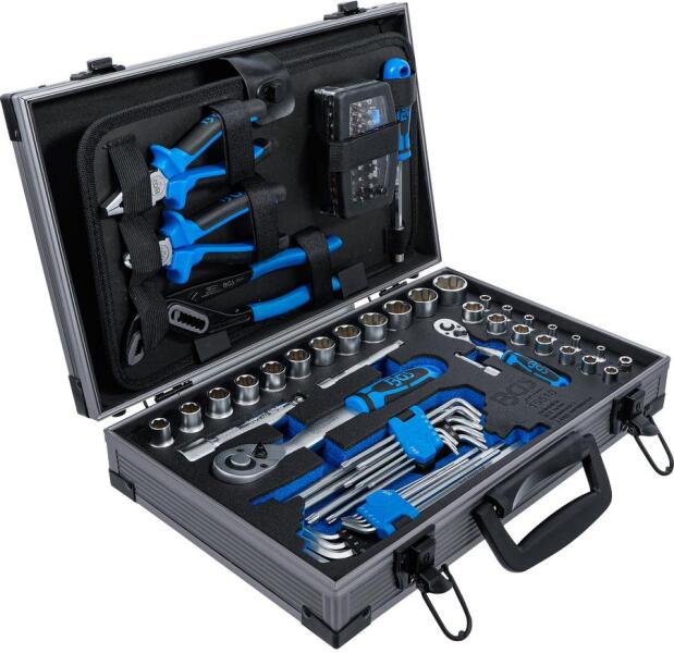 Ideális alapfelszerelés az igényes szerelők, valamint a kézi és barkácsolók számára. 85 db-os szett szerszámok széles skáláját kínálja, és számos alkalmazáshoz alkalmas. Nagy teherbírású, alumíniumból készült kemény tokban, megerősített sarkokkal, amelyek megvédik a tokot a sérülésektől és különösen tartóssá teszik azt. Szállítás közben a táskában lévő összes alkatrész jól védve van, és rugalmas pántok és hurkapántok rögzítik a helyükön. A szerszámtábla szennyeződéstaszító bevonatú MDF-faforgácslapból készül. Az alsó részbe ragasztott, masszív, kiváló minőségű keményhabból készült EPE habbetét minden szerszámnak biztos helyet biztosít. Króm-vanádium acélból készült dugókulcsok, hosszabbítók, megfordítható racsnisok és fogók. Felületkezelés: szatén krómozott. L-típusú csavarkulcsok és bitek kiváló minőségű króm-vanádium acélból (S2). A bitek intelligens színkódolási rendszerrel is rendelkeznek az egyes profilok számára. Tartalom: 1 kombinált fogó | 165 mm (BGS 369) 1 svéd oldalvágó fogó | 165 mm (BGS 393) 1 vízpumpa fogó | csuklós fogó | 240 mm (BGS 75111) 1 színes bitkészlet | 32 db (BGS 4816) 1 fordítható racsnis hajtókar | finom fogazású | 12,5 mm (1/2") (BGS 620) 1 "wobble" toldószár | 12,5 mm (1/2") | 125 mm (BGS 234) 1 dugókulcs, super lock | 12,5 mm (1/2") meghajtó | 10 mm (BGS 2410) 1 dugókulcs, super lock | 12,5 mm (1/2") meghajtó | 11 mm (BGS 2411) 1 dugókulcs, super lock | 12,5 mm (1/2") meghajtó | 12 mm (BGS 2412) 1 dugókulcs, super lock | 12,5 mm (1/2") meghajtó | 13 mm (BGS 2413) 1 dugókulcs, super lock | 12,5 mm (1/2") meghajtó | 14 mm (BGS 2414) 1 dugókulcs, super lock | 12,5 mm (1/2") meghajtó | 15 mm (BGS 2415) 1 dugókulcs, super lock | 12,5 mm (1/2") meghajtó | 16 mm (BGS 2416) 1 dugókulcs, super lock | 12,5 mm (1/2") meghajtó | 17 mm (BGS 2417) 1 dugókulcs, super lock | 12,5 mm (1/2") meghajtó | 18 mm (BGS 2418) 1 dugókulcs, super lock | 12,5 mm (1/2") meghajtó | 19 mm (BGS 2419) 1 dugókulcs, super lock | 12,5 mm (1/2") meghajtó | 21 mm (BGS 2421) 1 dugókulcs, super lock | 12,5 mm (1/2") meghajtó | 24 mm (BGS 2424) 1 fordítható racsnis hajtókar | finom fogazású | 6,3 mm (1/4") (BGS 618) 1 bitbefogó | 6,3 mm (1/4") belső hatszög | 200 mm (BGS 217) 1 "wobble" toldószár | 6,3 mm (1/4") | 100 mm (BGS 2231) 1 "wobble" toldószár | 6,3 mm (1/4") | 50 mm (BGS 2232) 1 dugókulcs, super lock | 6,3 mm (1/4") meghajtó | 4 mm (BGS 2344) 1 dugókulcs, super lock | 6,3 mm (1/4") meghajtó | 4,5 mm (BGS 2339) 1 dugókulcs, super lock | 6,3 mm (1/4") meghajtó | 5 mm (BGS 2345) 1 dugókulcs, super lock | 6,3 mm (1/4") meghajtó | 5,5 mm (BGS 2343) 1 dugókulcs, super lock | 6,3 mm (1/4") meghajtó | 6 mm (BGS 2346) 1 dugókulcs, super lock | 6,3 mm (1/4") meghajtó | 7 mm (BGS 2347) 1 dugókulcs, super lock | 6,3 mm (1/4") meghajtó | 8 mm (BGS 2348) 1 dugókulcs, super lock | 6,3 mm (1/4") meghajtó | 9 mm (BGS 2349) 1 dugókulcs, super lock | 6,3 mm (1/4") meghajtó | 10 mm (BGS 2350) 1 dugókulcs, super lock | 6,3 mm (1/4") meghajtó | 11 mm (BGS 2351) 1 dugókulcs, super lock | 6,3 mm (1/4") meghajtó | 12 mm (BGS 2352) 1 dugókulcs, super lock | 6,3 mm (1/4") meghajtó | 13 mm (BGS 2353) 1 dugókulcs, super lock | 6,3 mm (1/4") meghajtó | 14 mm (BGS 2354) 1 bitadapter rögzítőgolyóval | 6,3 mm (1/4") meghajtás | belső hatszög 6,3 mm (1/4") (BGS 8213) 1 L- torx készlet | extra hosszú | T-csillag (Torx) T10 - T50 | 9 db (BGS 793) 1 L- imbusz készlet | extra hosszú | belső hatszög 1,5 - 10 mm | 9 db (BGS 808) Súly: 6 kg