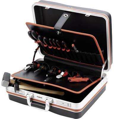 ABS anyagú koffer borítás · Körbefutó alukerettel, 2 zárható csapózárral · Terhelhetőség max. 15 kg · 2 szerszámtartó lap összesen 27 rekesszel · Kapcsos irattartó rekesz 400 mm széles · Szabadon beosztható alsó héj választó lappal · Fém fedéltartó és zsanér · Műanyag lábak · Süllyesztékes kovácsolású fogók a legkiválóbb szerszámacélból · Magasfényű polírozás, krómozott · Kétkomponensű nyél · Fogók, TÜV-GS vizsgálattal.