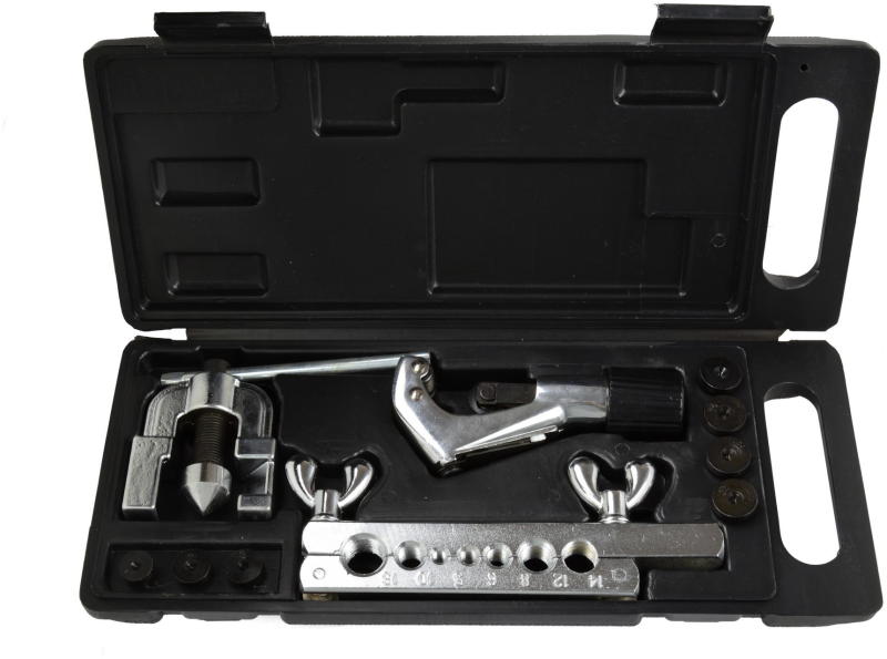 A készlet fékcsövek és üzemanyagcsövek gyártására szolgál. Használhatja rézből, sárgarézből és alumíniuból készült csövek vágására és szélesítésére is. A csövek falai nem lehetnek vastagabbak mint 1 mm. A készlet 7 adaptert tartalmaz a csövek szélesítésére. A csővágó is tartozék.   CSOMAGOLÁS TARTALMA