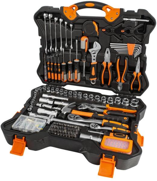 Hobby szerszámkészlet és tartozékok 256 db : 6 db csillag-villáskulcs (9-10-13-14-16-17 mm) (9-10-13-14-14-16-17 mm) 12 db dugókulcs 1/4"-os racsnihoz (4-4,5-5-5-6-6-7-8-9-10-10-11-12-13-14 mm) 16 db dugókulcs 1/2" racsnihoz (10-11-12-13-13-14-15-16-17-18-19-19-20- 21-22-24-27-30 mm) 2 db gyújtógyertya dugókulcs (16, 21 mm) 1/2" racsnihoz 1 db mély dugókulcskulcs 19 mm-es hatszögletű dugókulccsal 1/2" racsnihoz 1 db 120 mm-es hosszabbító 1/2" racsnihoz 1 db hosszabbító 250 mm-es csúszó taggal 1/2" racsnihoz 1 db 100 mm-es hosszabbító 1/4" racsnihoz 2 db univerzális kardáncsukló 1/4" és 1/2" racsnihoz 1 db adapter hatszögletű bitekhez 1/4" racsnira 1 db adapter hatszögletű bitekhez 1/2" racsnihoz 2 db műanyag bilincs 4 db precíziós csavarhúzó 1 db feszességmérő 1 db 5 m hosszúságú mérőszalag 1 db 8" állítható csavarkulcs 1 db 7" kombinált fogó 1 db oldalvágó 6" 1 db félkörfogó keskeny pengével 6" 1 db fogó (vízvezeték fogó) 4 db csavarhúzó - 6 x 100 mm (lapos), 5 x 75 mm (lapos), PH 1 x 75 mm (Phillips) és csavarhúzó bit 8 db imbuszkulcs-készlet (1,5-2-2,5-3-4-5-5-5,5-6) 1 db ácskalapács 1 db 1/2" hajlított racsni 1 db 1/4" hajlított racsni 1 db dugókulcs 1/4" 1 db LED-es zseblámpa 30 db 8 mm-es bit 120 db kötőelem 31 db - bit készlet dobozban - adapterrel együtt (hosszabbító) 1 db BMC tok