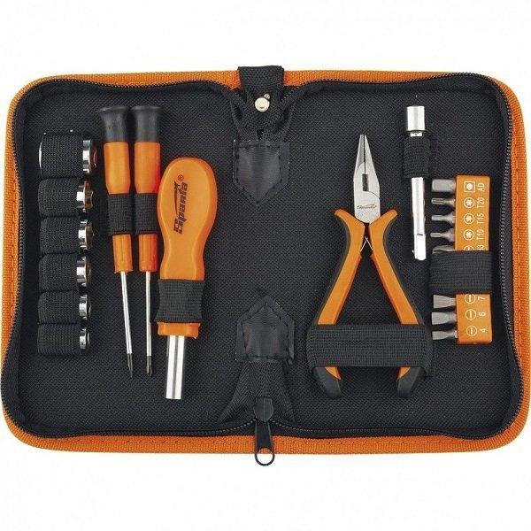 Tartalmaz csavarhúzókat, köztük óráscsavarhúzókat is a precíziós munkához, biteket és dugókulcsfejeket, hosszabbítót a nehezen elérhetõ helyeken történõ könnyű munkához, hosszú orrú fogót.